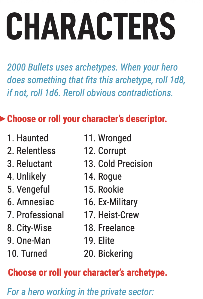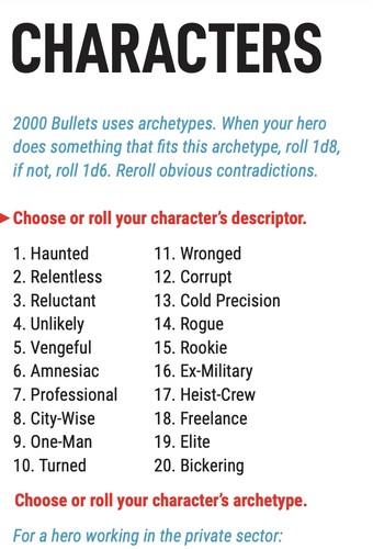 2000 Bullets includes, for the first time, one of the GM tools I developed and have been using for quite some time: the Plot Die. This is a plot-generating machine, packed into one handy table. Create suspenseful adventures on the fly!